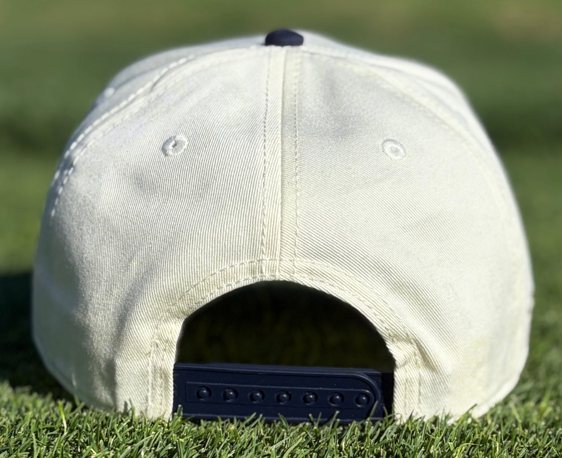 Structured front, contrast dome, plastic snapback, curved peak, tonal eyelets, one size fits all.